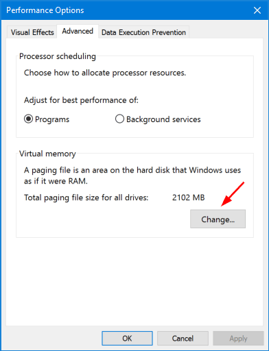 - 选择先进的选项卡,然后单击改变按钮下的虚拟内存部分。