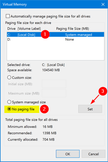 - 选择默认页面文件驱动器。选择没有分页文件选项并单击放。