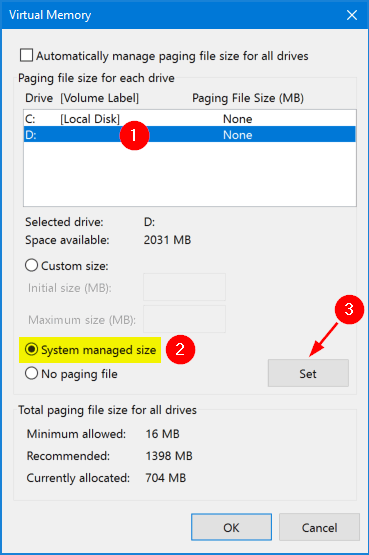 - 现在在您拥有的另一个驱动器上指定一个新的页面文件。为此,请从列表中选择所需的驱动器,然后选择系统管理的大小选项。点击放应用您的更改。