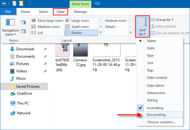 步骤 3:选择对此文件夹中的项目进行排序上升(默认)或下降带有所选详细信息的订单。