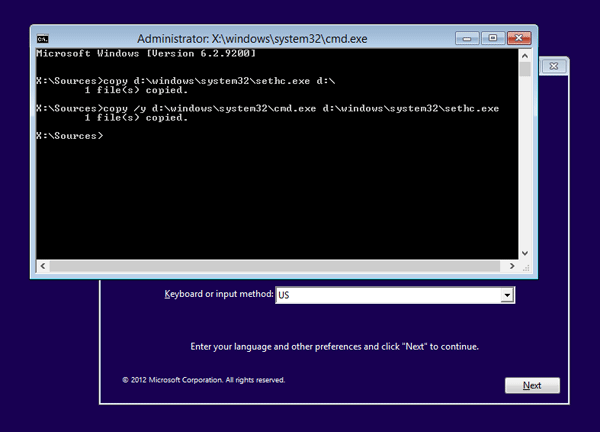 复制 /yc:\windows\system32\cmd.exe c:\windows\system32\sethc.exe另请阅读:如何修复从 Windows 8 安装光盘启动时出现的错误 0x0000005D