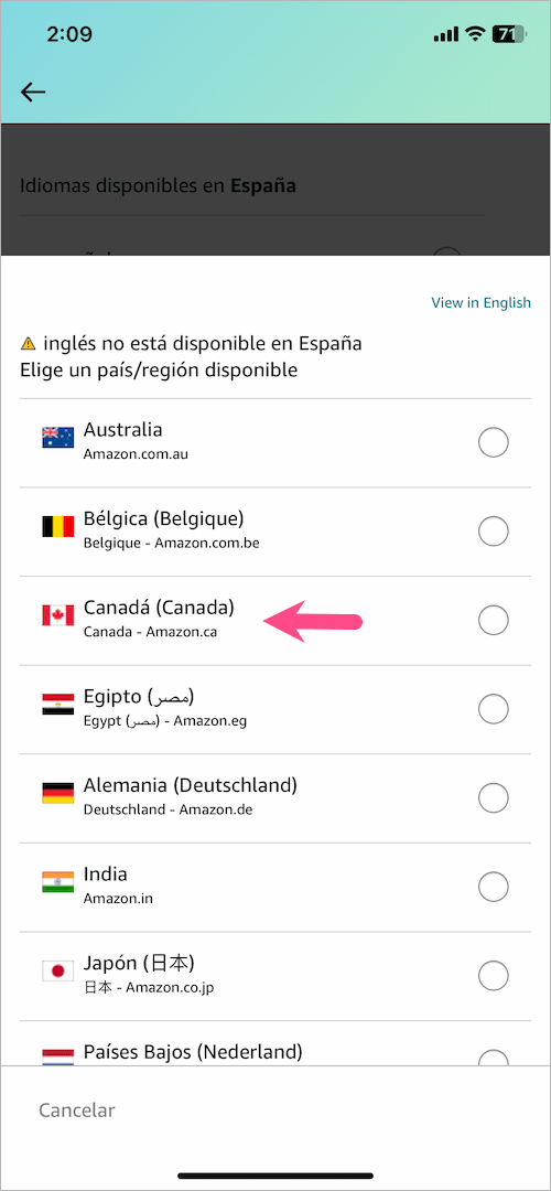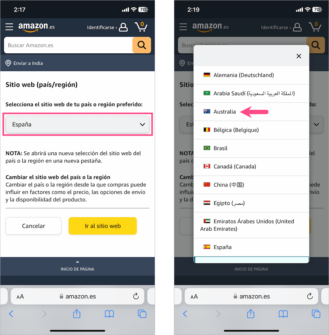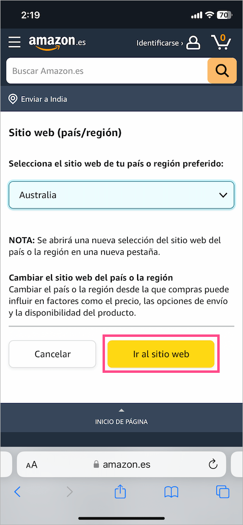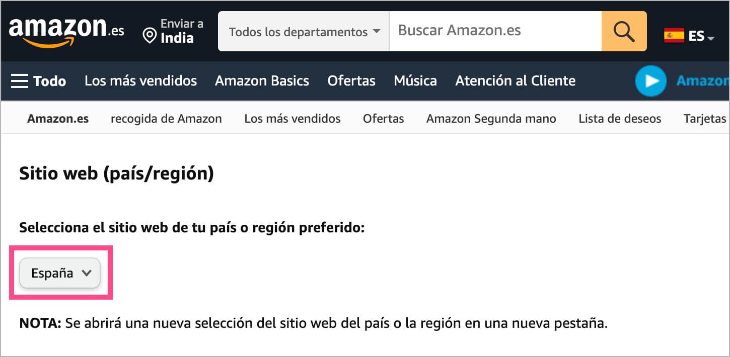 3.改变国家:当您更改首选国家或地区时,亚马逊会自动切换到相应的语言。例如,将国家/地区从印度更改为西班牙会将您重定向到 Amazon.es,并且语言将设置为西班牙语。