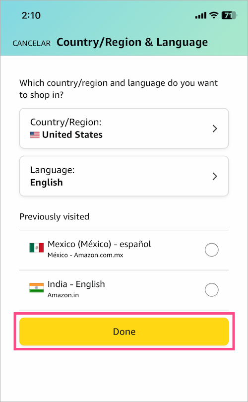 - 所选国家或地区的网站现在将在新选项卡或亚马逊应用程序中打开。