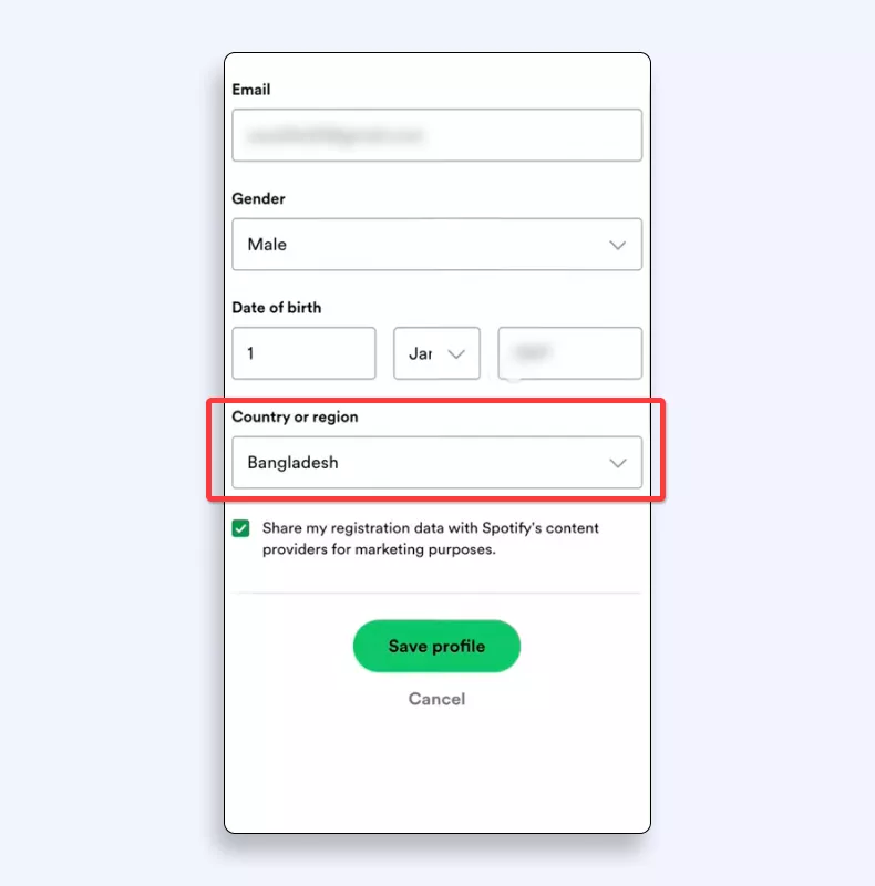 - 在浏览器中打开 Spotify 网站,转到帐户设置,然后选择您所需的国家或地区。