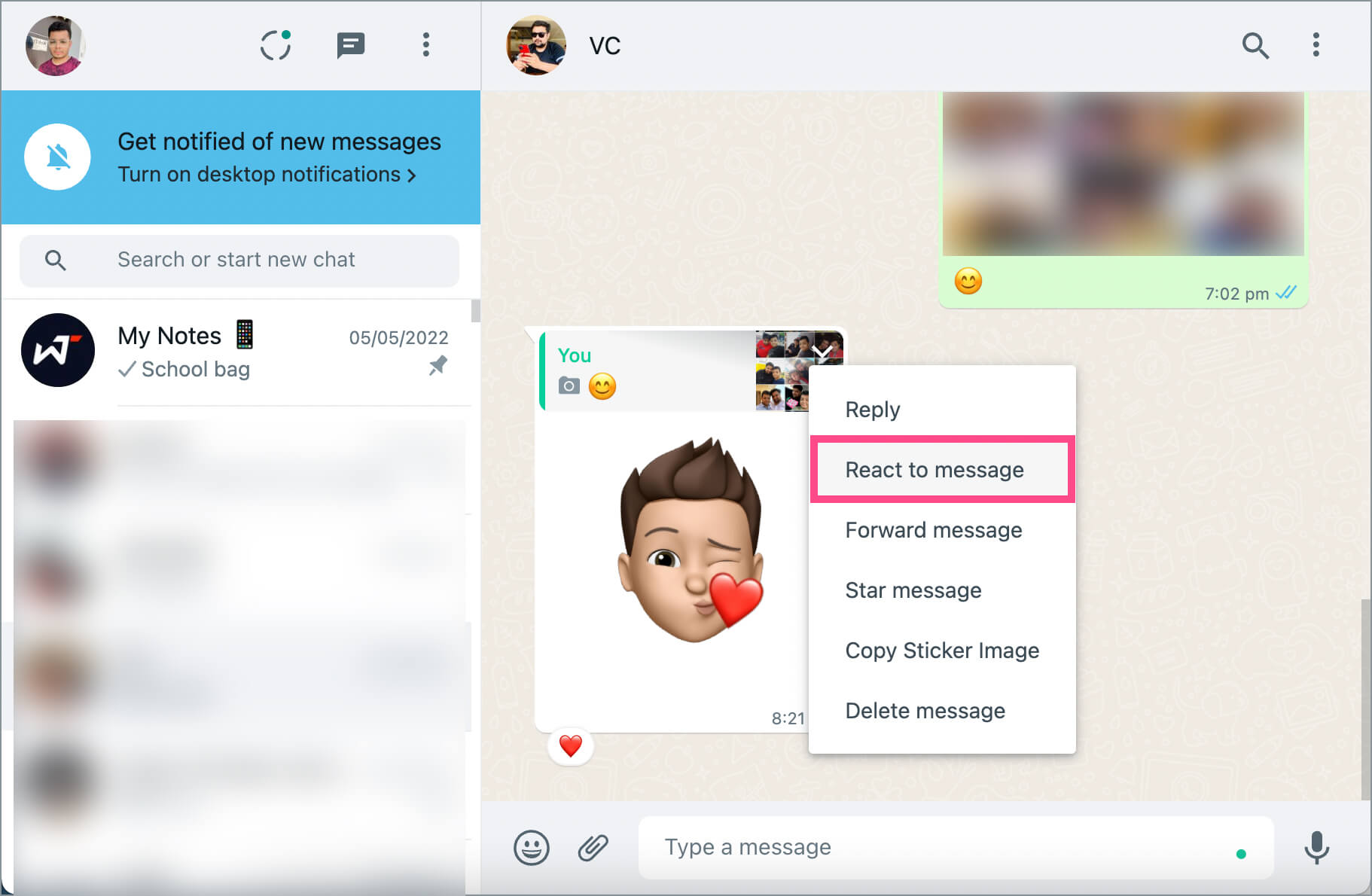 提示:对消息做出反应、更改或删除表情符号反应的步骤与 WhatsApp Web 上类似。唯一的变化是您必须将光标悬停在消息上,然后单击下拉箭头才能找到相关选项。