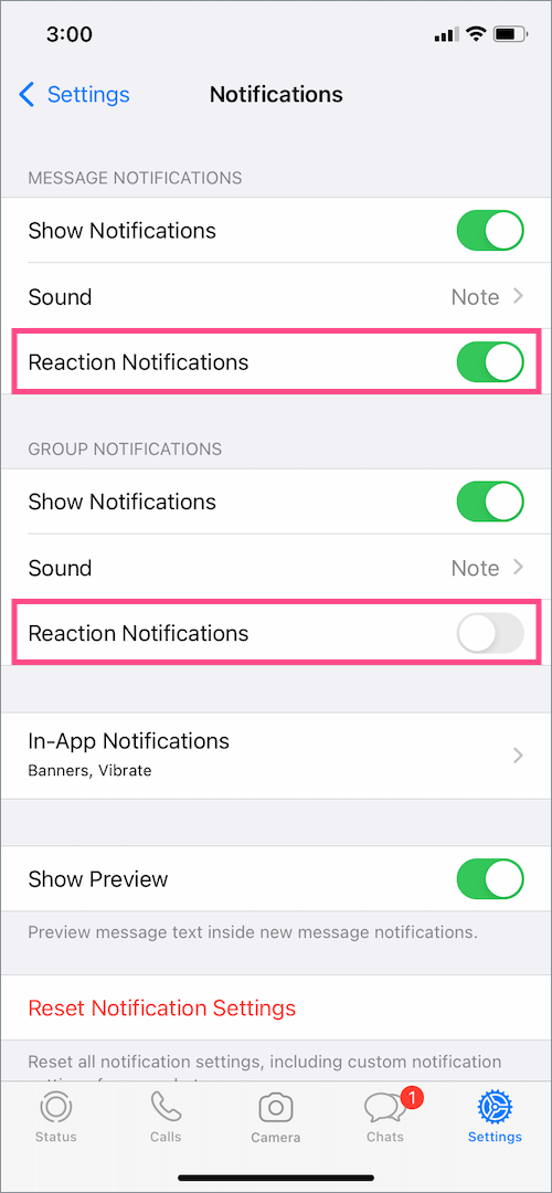 幸运的是,有一个设置允许用户从个人和群聊中删除表情符号反应通知。