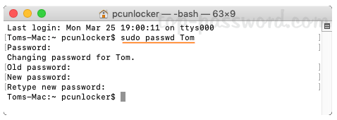- 按 Enter 后,系统将首先提示您输入当前登录的管理员帐户的密码。之后,您需要为目标帐户输入两次新密码。如果您运行的是 macOS Mojave,则需要旧密码才能设置新密码。