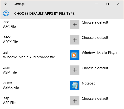 例如,如果您想在记事本中打开 .asmx 文件,只需向下滚动到左侧的“.asmx”,然后选择后,在右侧选择要设置为默认值的应用程序。就是这样!