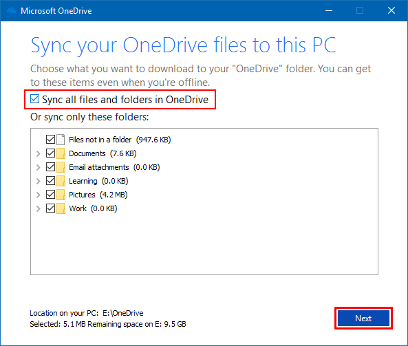 第11步:选择你想要的下载(同步)到 PC 上的 OneDrive 文件夹,然后单击下一个。