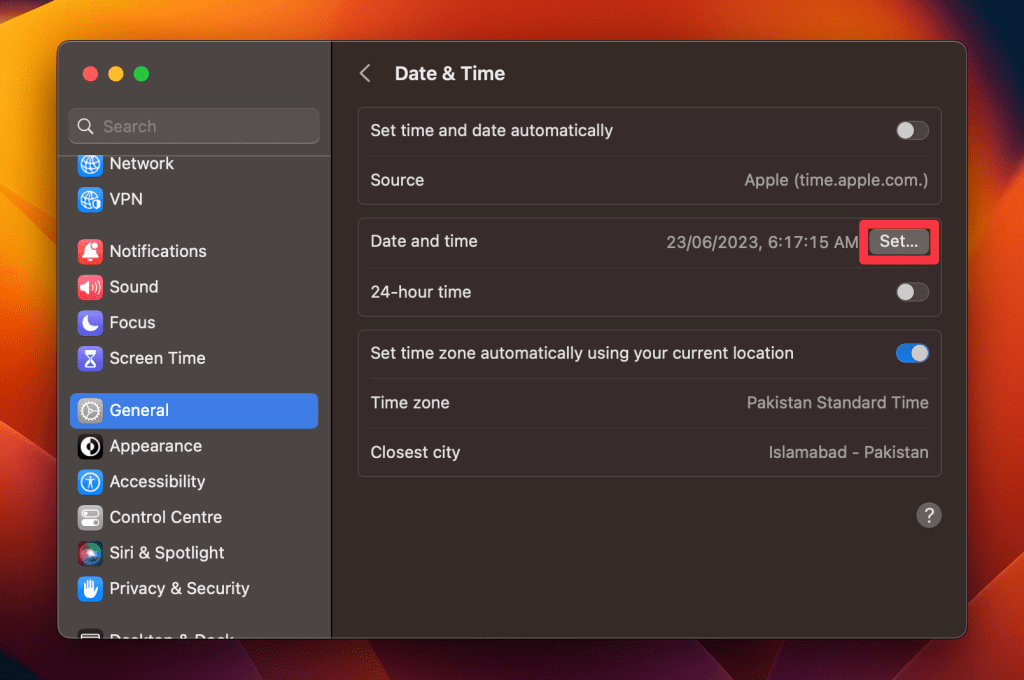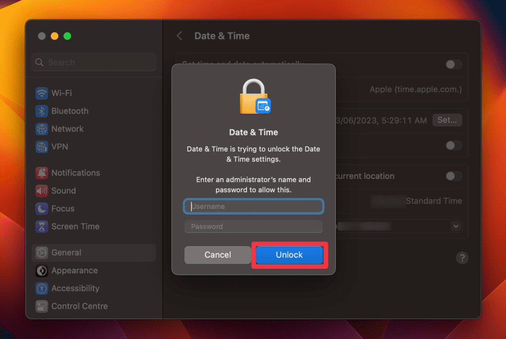 - 接下来,前往系统设置 > 常规 > 日期和时间并打开使用您当前的位置自动设置时区切换以确保您的 Mac 始终拥有正确的时间和时区信息。