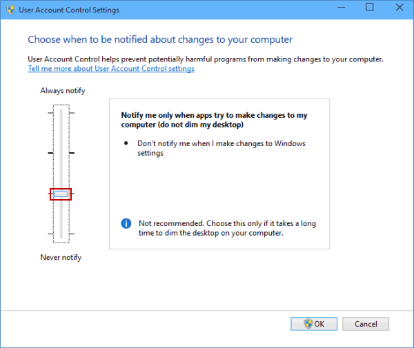 要将 UAC 恢复为其默认设置,请按照方法 1 将滑块设置为第二高级别,然后单击“确定”。