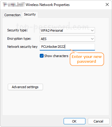 - 前往安全选项卡。在中输入您的新 Wi-Fi 密码网络安全密钥字段并单击好的。当然,你可以勾选“显示字符”复选框可在更改之前查看旧的已保存密码。