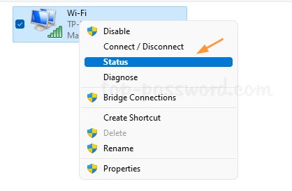 - 它将启动“网络连接”窗口,其中列出所有可用的网络适配器。右键单击您的无线网络适配器并选择地位从弹出菜单中。