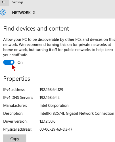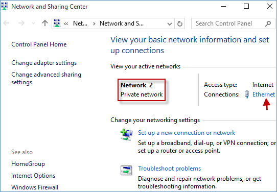 提示:或者当您通过以下方式设置网络时开启或者关闭对于以太网连接,您也可以返回此网络与互联网窗口来选择网络与共享中心检查网络是否已更改为的选项私人或公共。 (见下图)