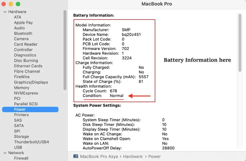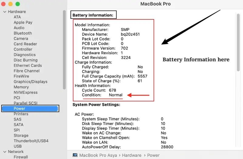 (三)。在左侧边栏中,找到并单击“电源”。您将看到有关电池的详细信息,包括循环次数、充满电容量、当前容量等。