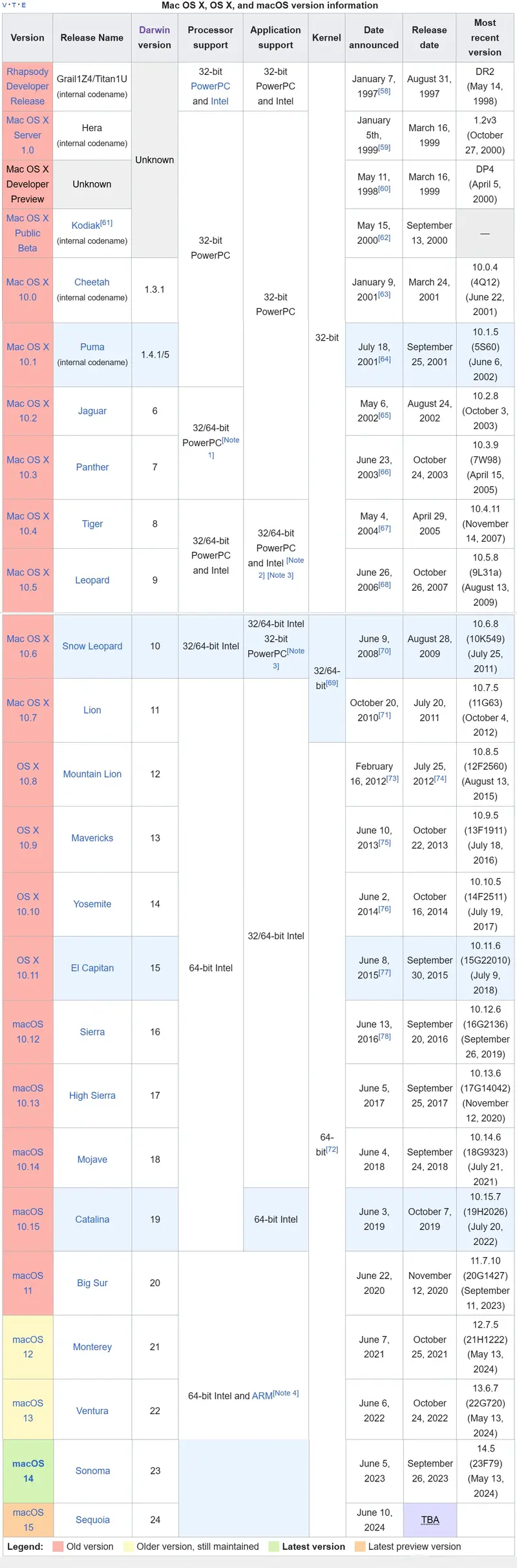 4. 您可以参考下表了解您的macOS版本、发布日期等相关信息。