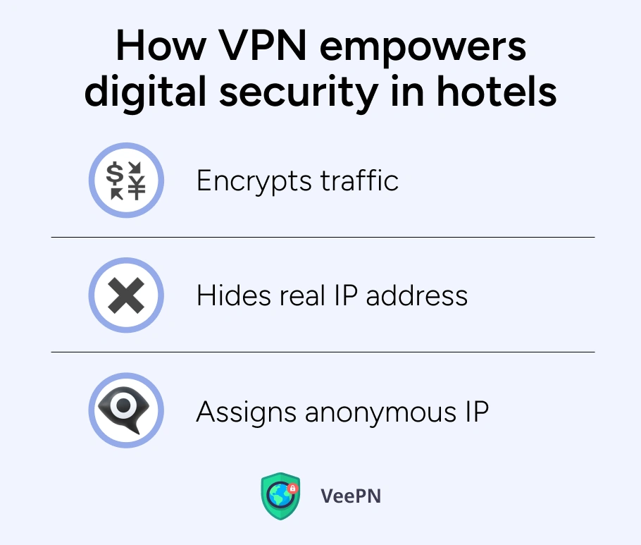 虚拟专用网络通过 VPN 加密保护您的流量。它将您使用的所有数据封装在从设备到网络的安全隧道中。这意味着酒店网络上的黑客无法访问您的在线操作:读取您的电子邮件、密码或财务信息。