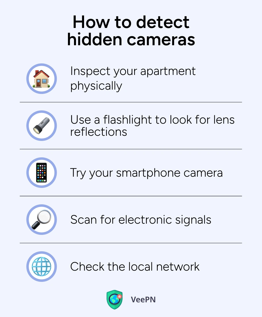 无需额外手段的第一道防线就是扫描公寓的每个角落和缝隙,并检查酒店房间内是否有隐藏的摄像头。检查镜子上是否有洞,或可疑的污迹。灯上或者玩具或时钟等装饰品上是否有任何小针孔?任何东西都可能有隐藏的摄像头,所以安全总比后悔好。