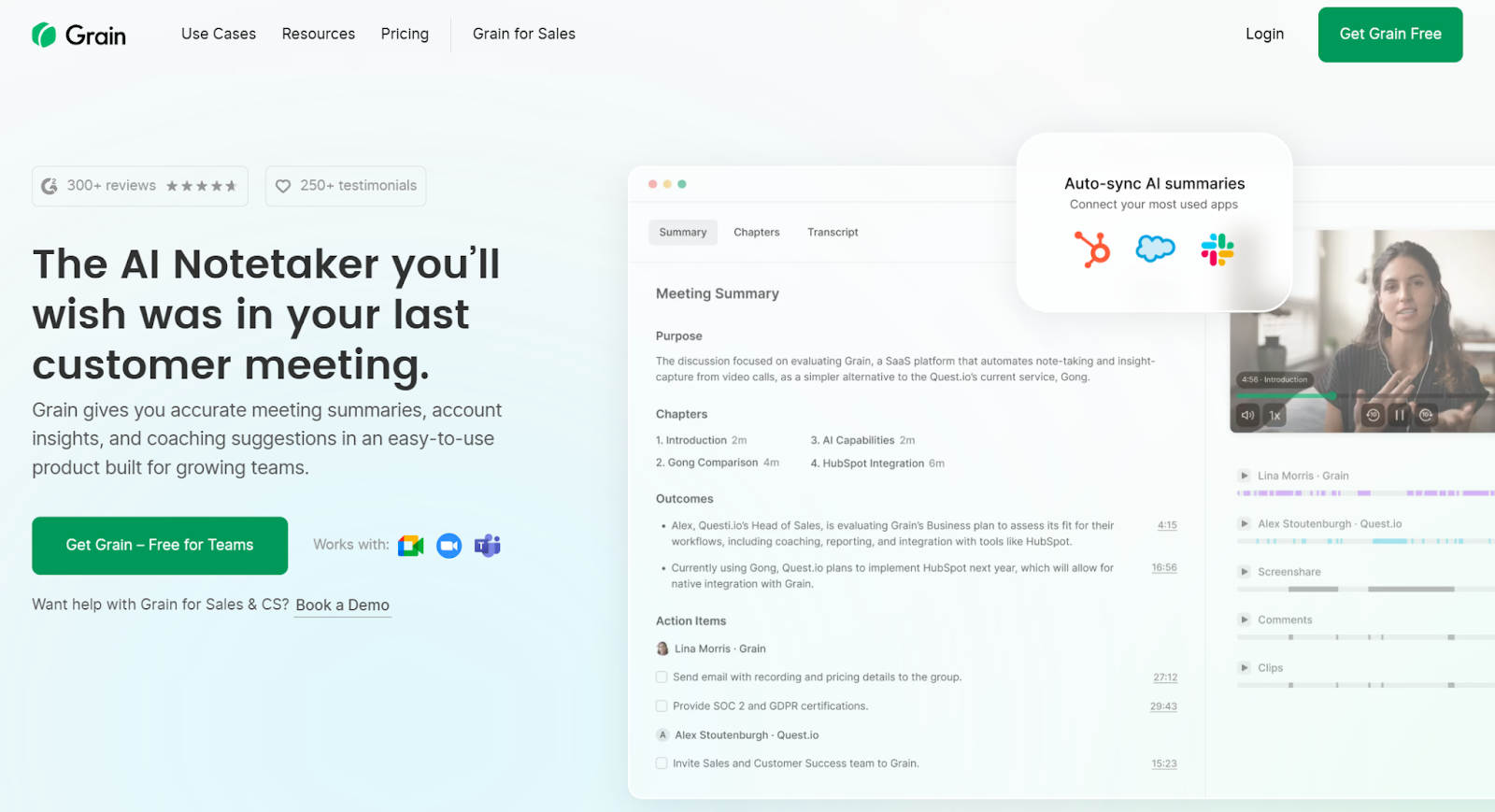Grain 是一款人工智能笔记应用程序,专为销售、客户成功和产品团队而设计。它可以捕获详细的会议记录、创建视频集锦并自动更新您的 CRM。