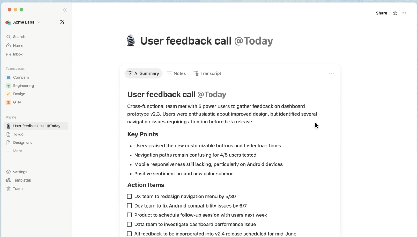 是的! Notion 现在包括 AI 会议笔记,可以直接在工作空间内转录、总结和组织会议内容。