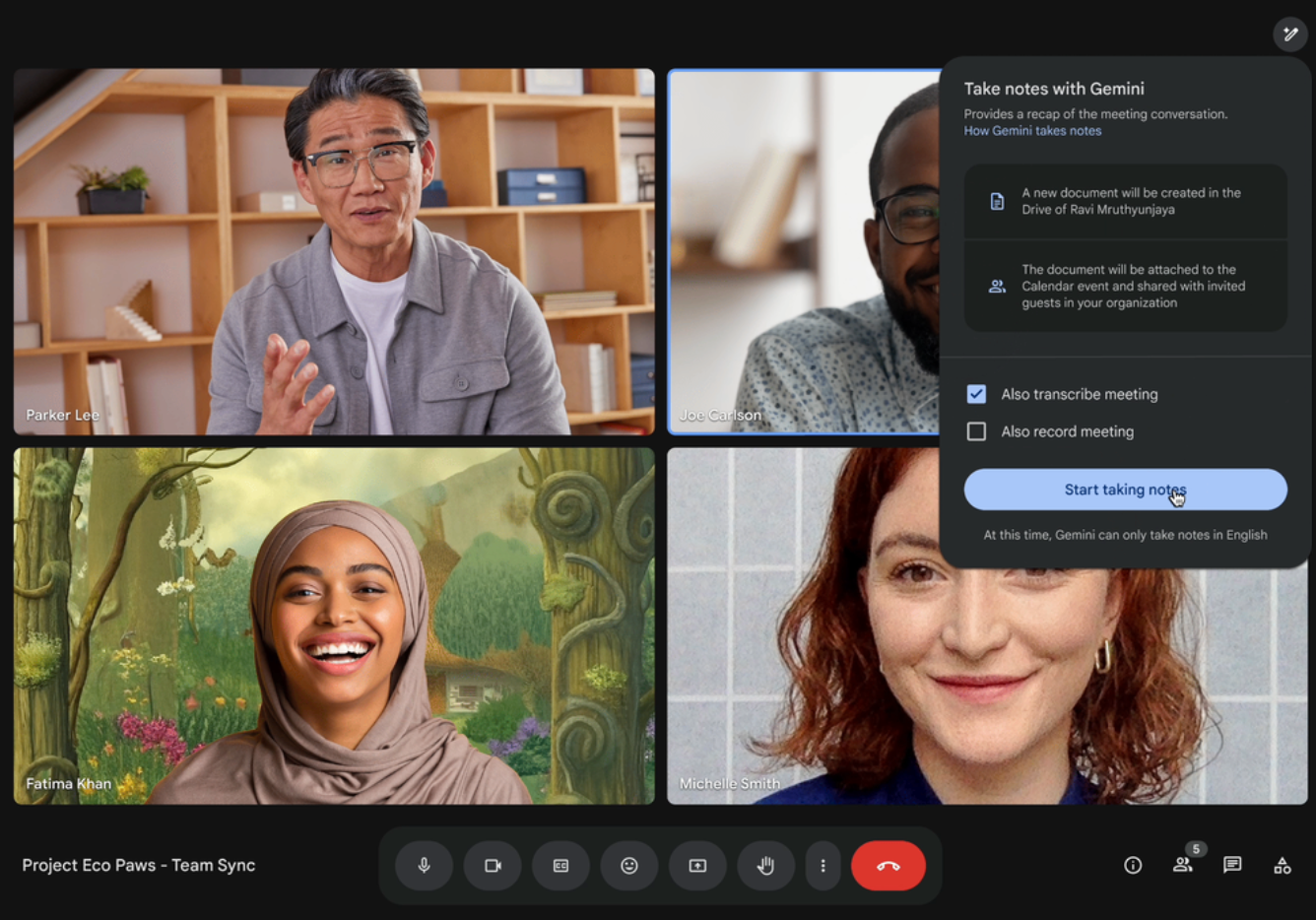 Google Meet 的“为我做笔记”功能由 Gemini 提供支持,使用人工智能将会议直接转录和总结为 Google 文档。它在 Google Meet 中原生运行;没有机器人,没有下载。只需点击即可开始记笔记,摘要就会通过 Google 日历自动共享。