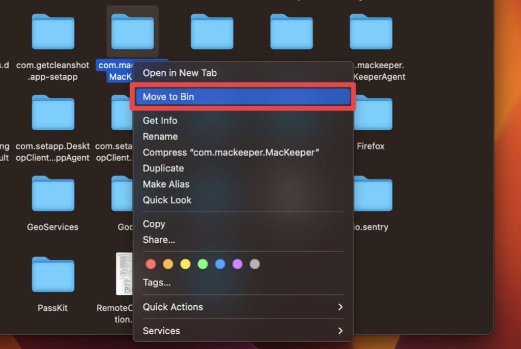 - 右键单击该文件夹并选择移至垃圾箱从菜单中。