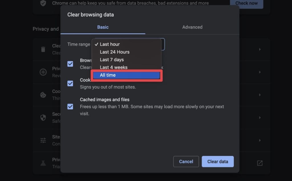 - 在里面选择你要清除缓存的时间范围清除浏览数据弹出窗口。如果您想清除所有内容,请选择所有时间。