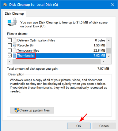 - 找到并检查缩略图选项,然后单击好的删除/清除缩略图缓存。