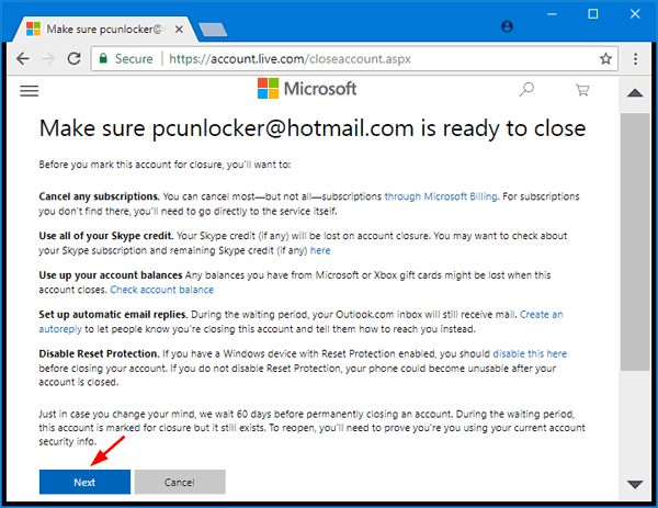 - 验证您的身份后,Microsoft 将通知您在关闭帐户之前必须首先执行的所有操作。点击下一个。