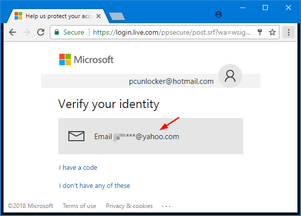 - 您将进入以下页面,该页面将使用安全代码验证您的身份。在这种情况下,我们使用辅助电子邮件地址来接收安全代码。