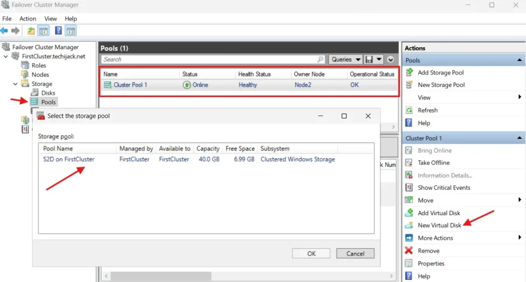 您可以通过从故障转移群集中单击“新建虚拟磁盘”来创建虚拟磁盘,然后创建镜像卷并对其进行格式化。