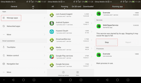 步骤2:您会看到此华为 Android 手机上安装的所有应用程序。转到跑步选项,您现在可以查看 Android 上运行的所有应用程序。