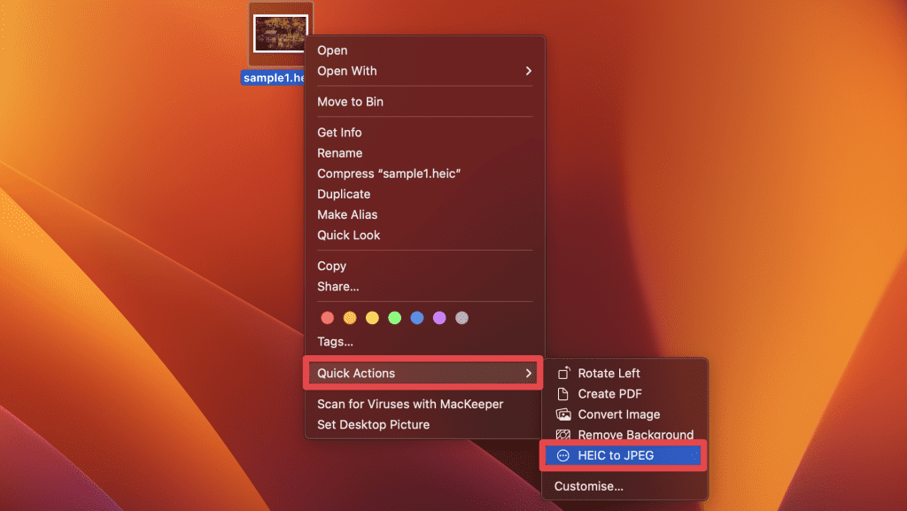 - 右键单击 HEIC 文件,将鼠标悬停在快速行动,然后选择您刚刚创建的操作(在我的例子中为 HEIC 到 JPEG)将图像转换为 JPG。