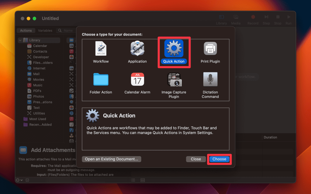 - 打开 Automator 并通过单击创建一个新文档新文件按钮。