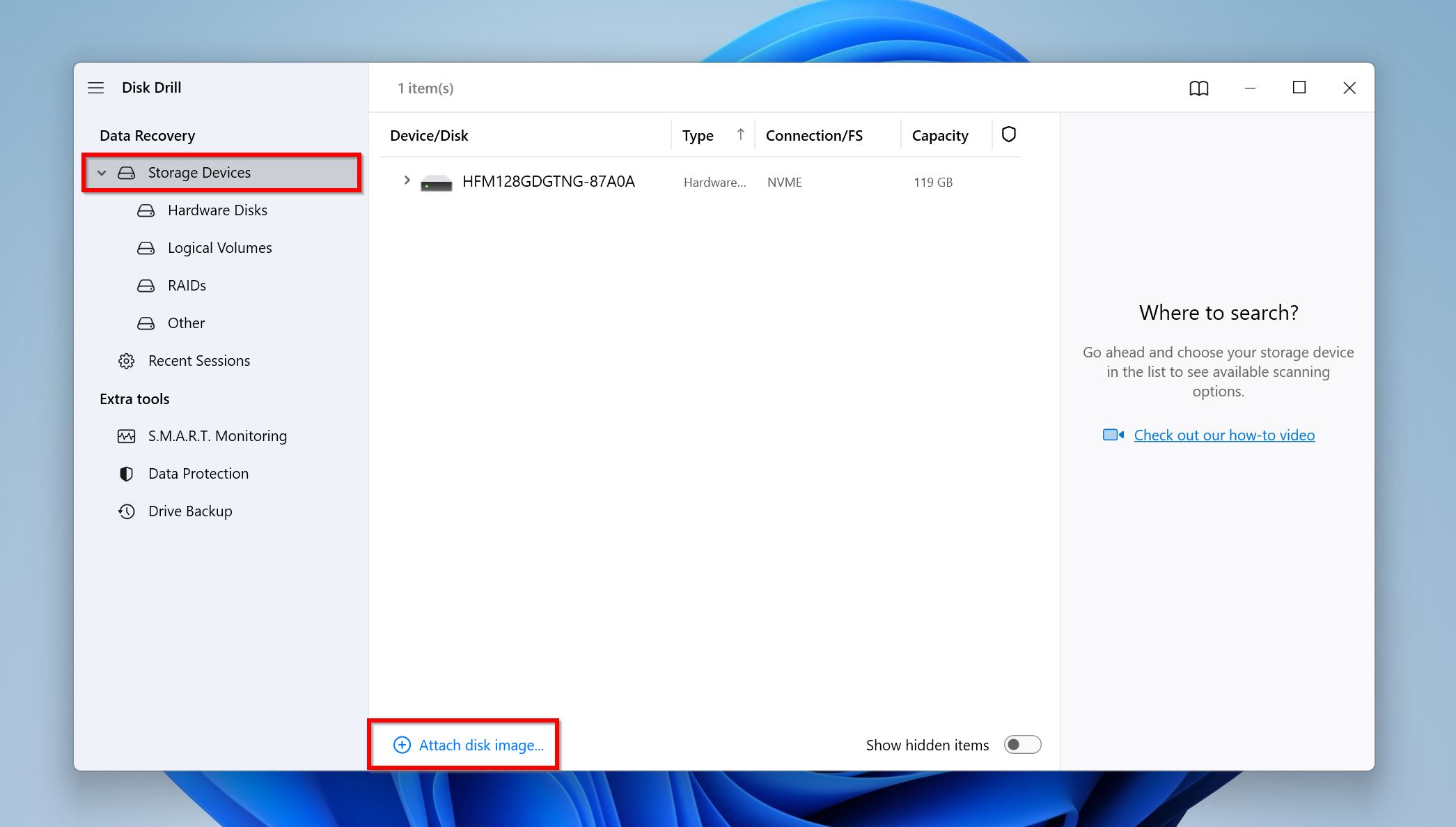 - 打开 Disk Drill 并确保您位于存储设备屏幕。
