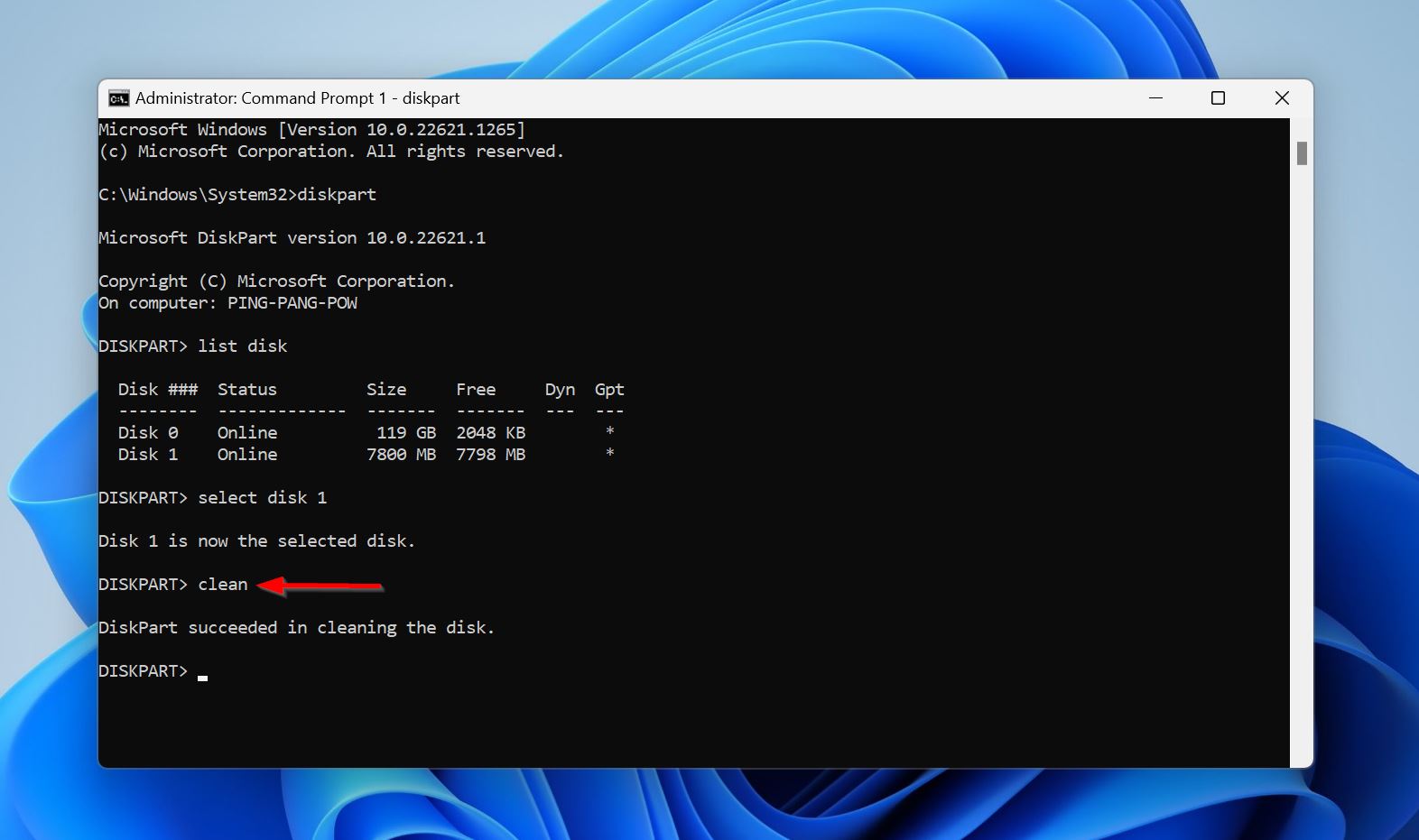 - 类型干净的并按 Enter 键以清除磁盘中的所有信息。