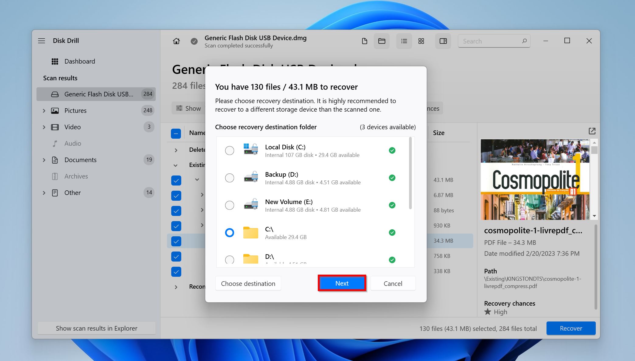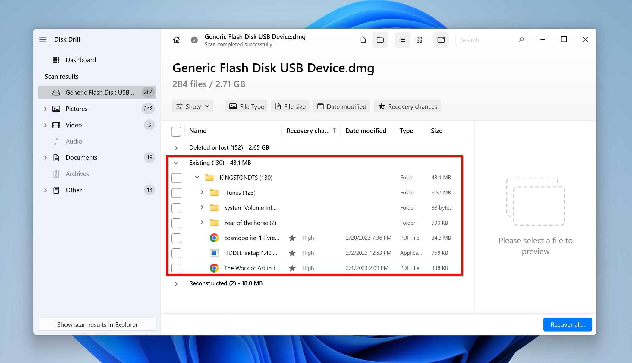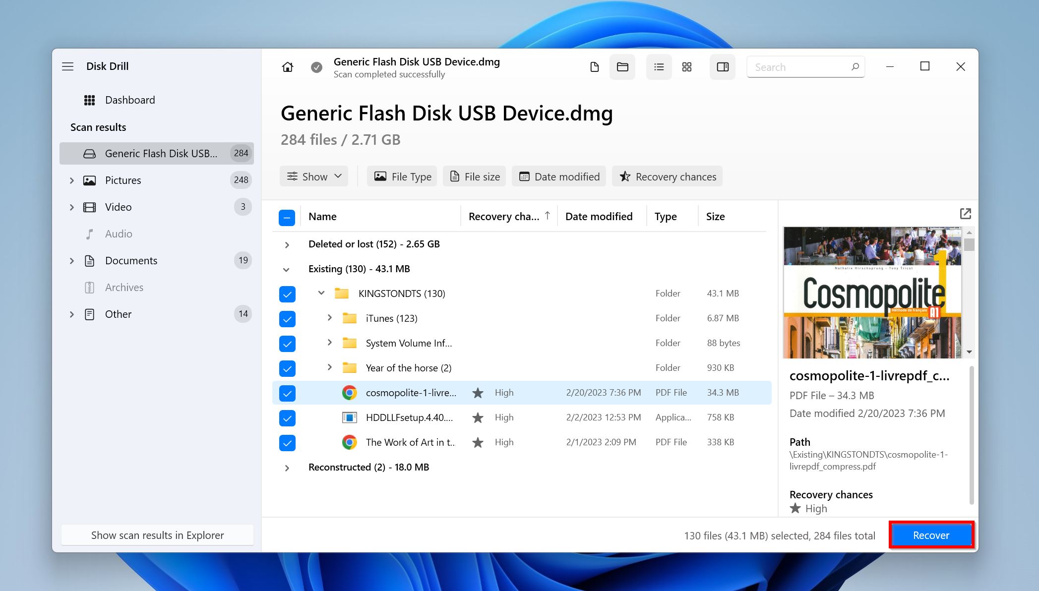 - 使用复选框选择要恢复的文件。 Disk Drill 将显示所选文件的预览。确认无误后,点击恢复。
