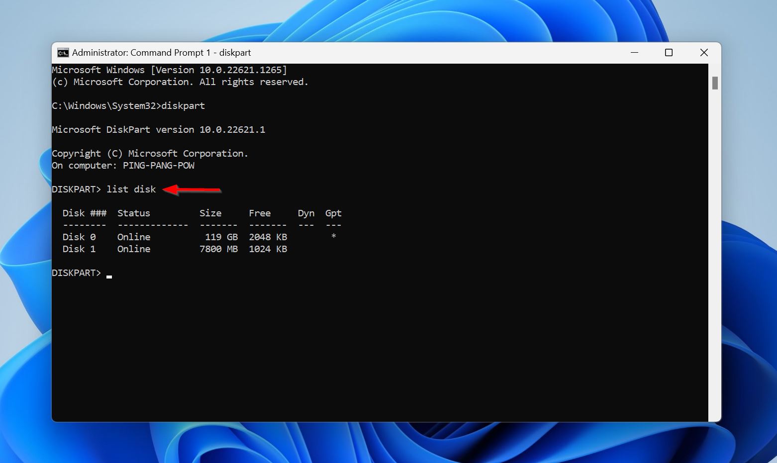 - 类型列出磁盘并按 Enter 键以显示连接到您的 PC 的所有存储磁盘。