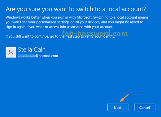 - 弹出屏幕将询问您是否确定要切换到本地帐户。点击下一个继续。