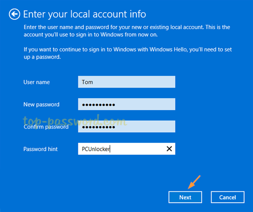 - 在以下屏幕中,填写要用于转换后的本地帐户的用户名、密码和密码提示的详细信息。点击下一个。