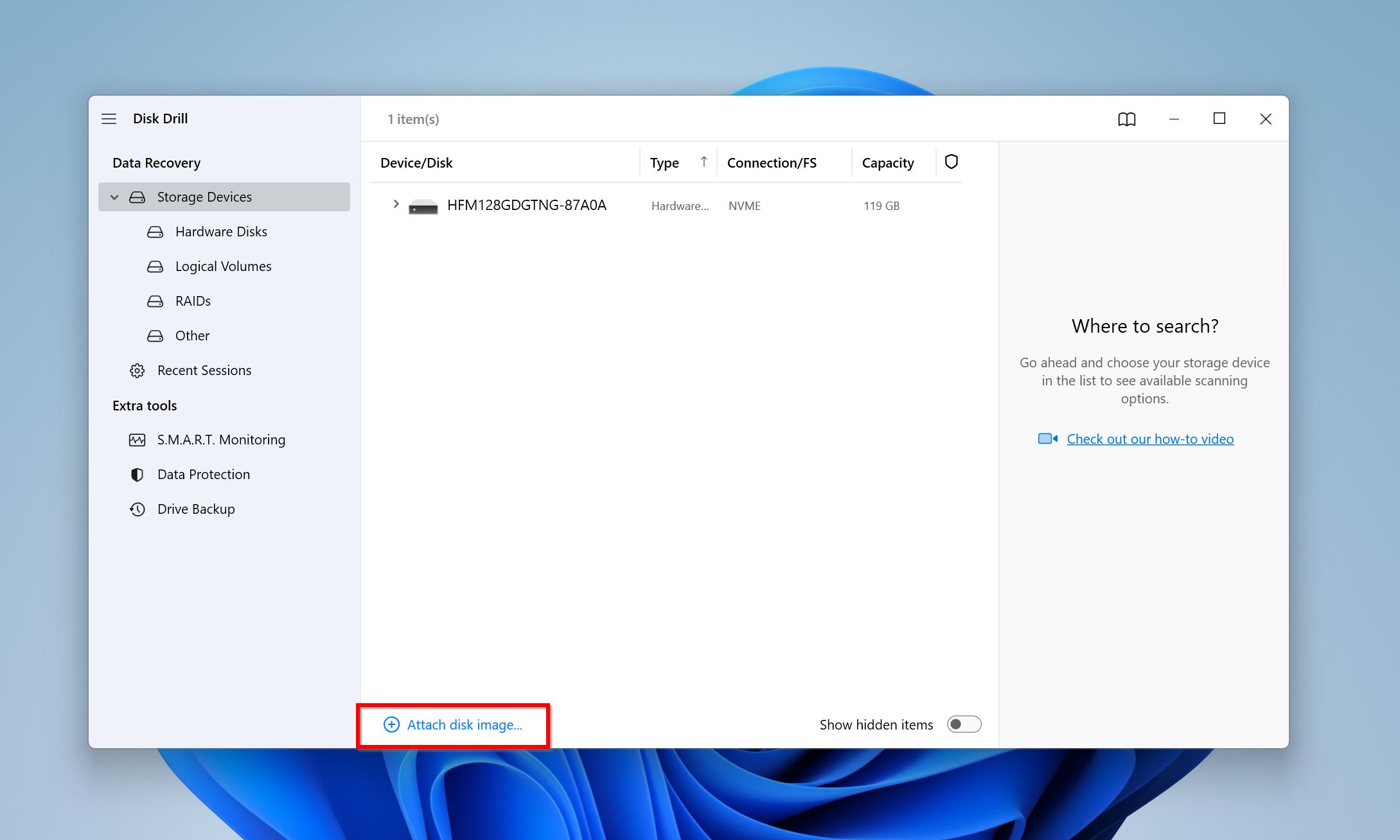 - 点击附加磁盘映像并浏览您之前创建的磁盘映像。双击它,它将被添加到 Disk Drill 中。