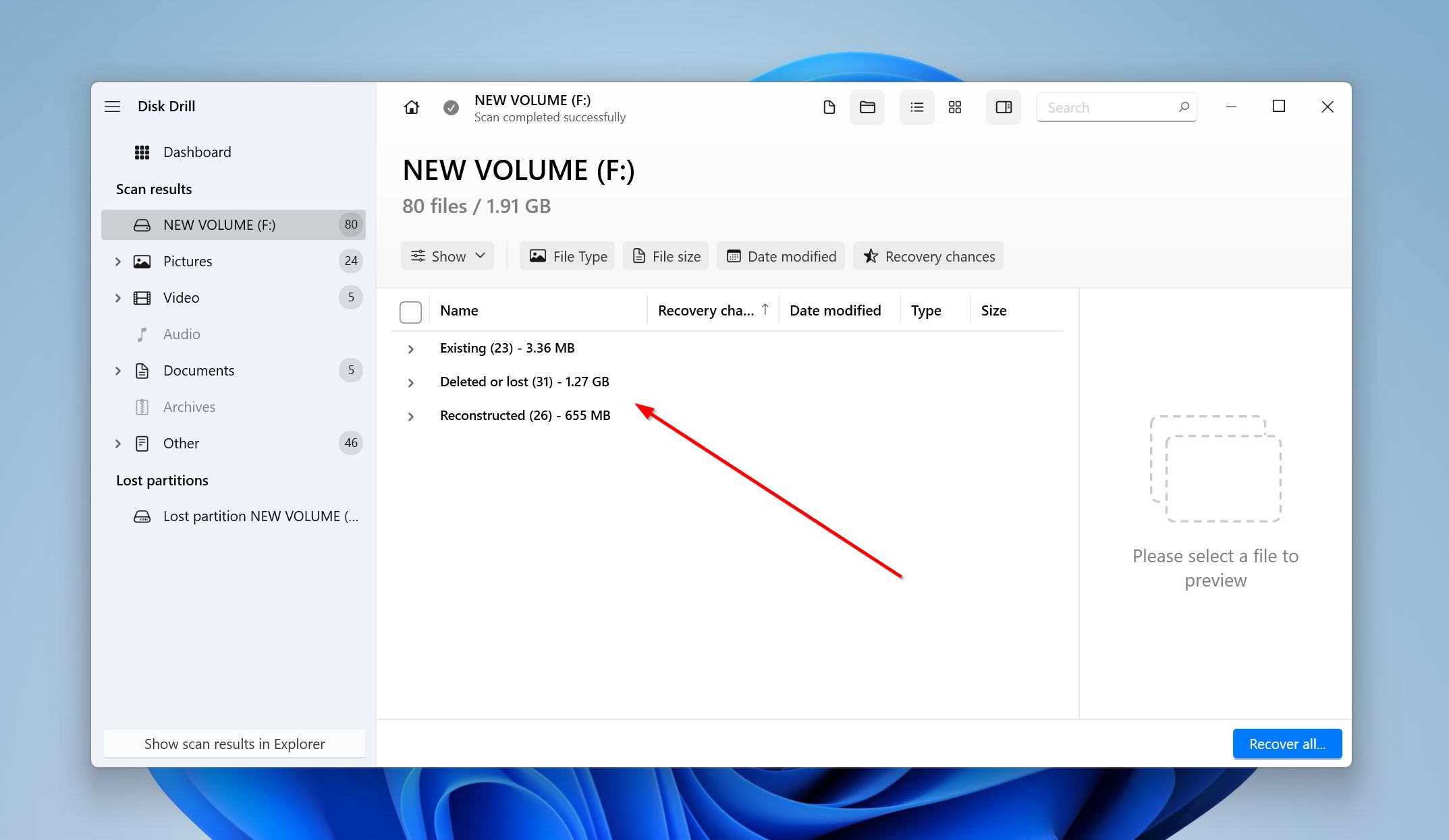 - 展开已删除或丢失和重建部分以查看 Disk Drill 发现的所有已删除文件。