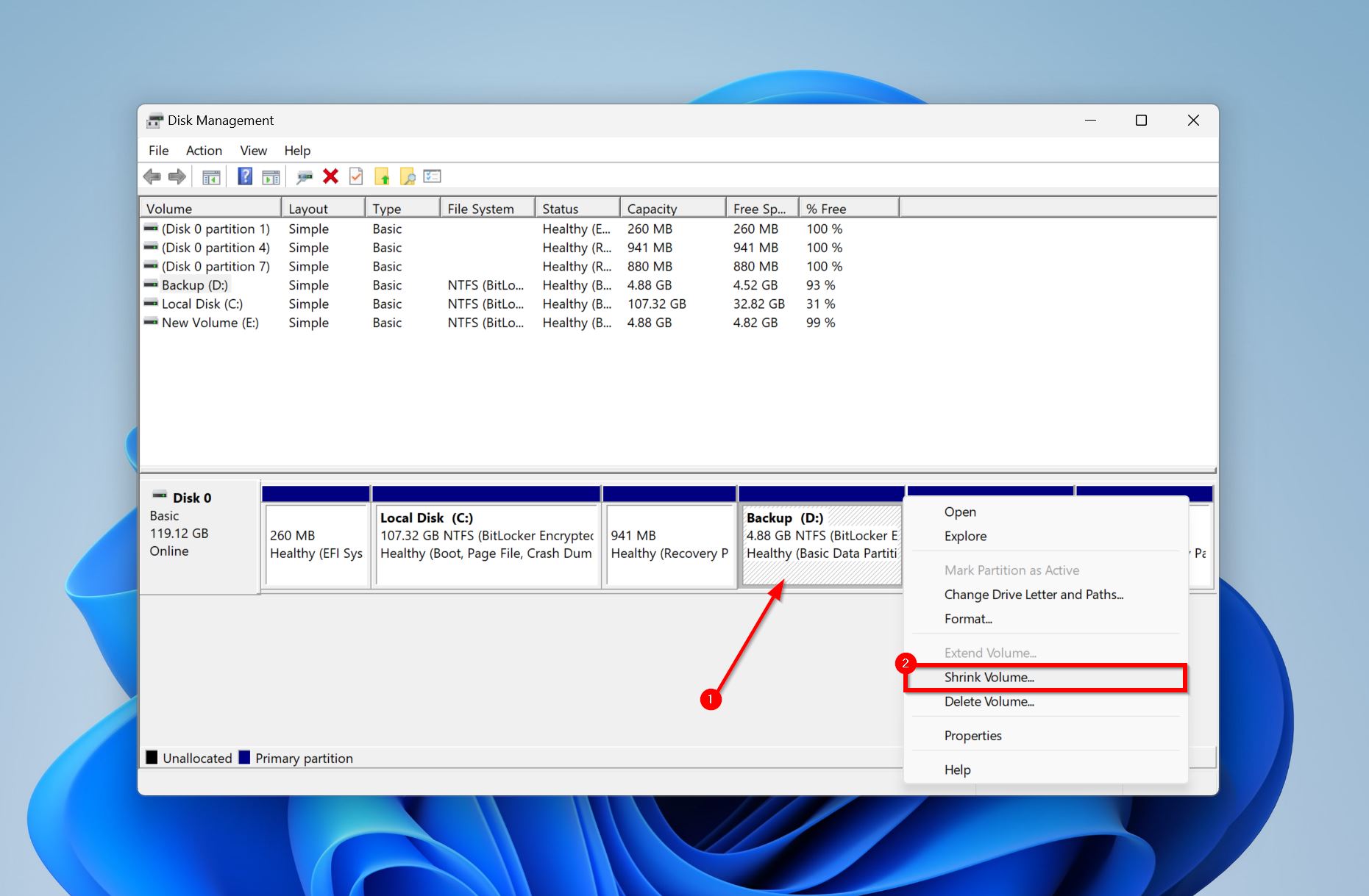- 在“磁盘管理”窗口的底部,右键单击要缩小的分区,然后单击收缩体积。