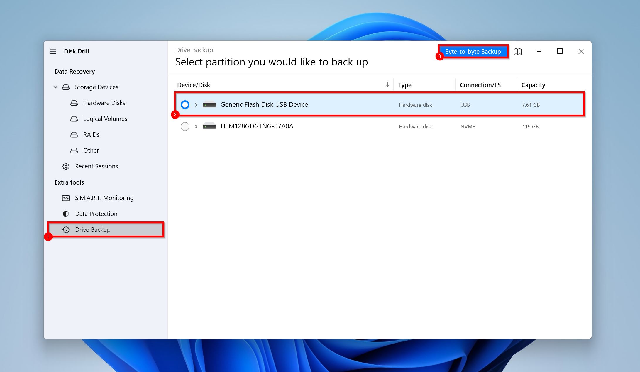 - 选择要从 NTFS 转换为 FAT32 的驱动器,然后单击字节到字节备份按钮。