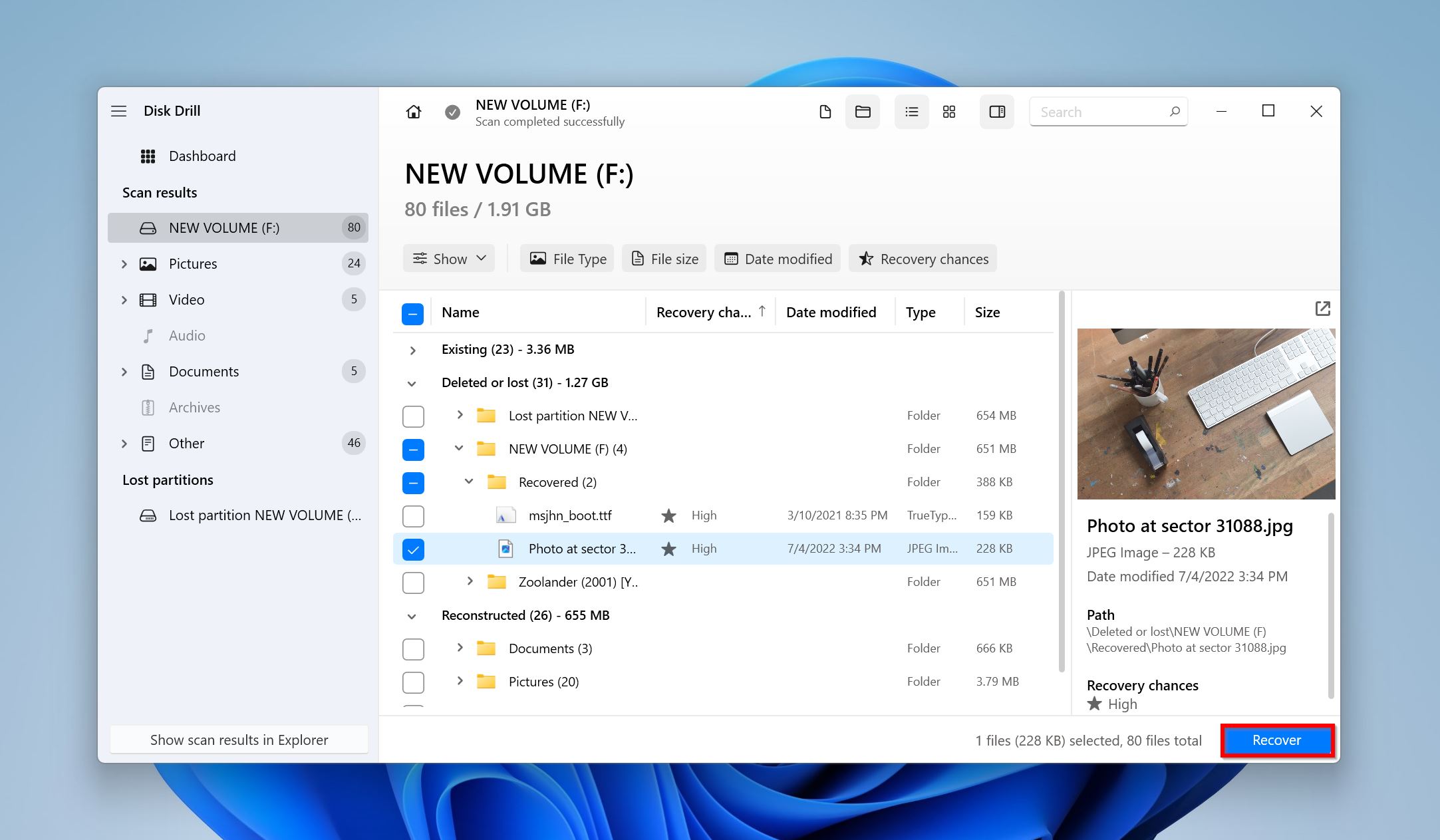 - 使用复选框选择文件。 Disk Drill 显示当前所选文件的预览,以便于选择。点击恢复。