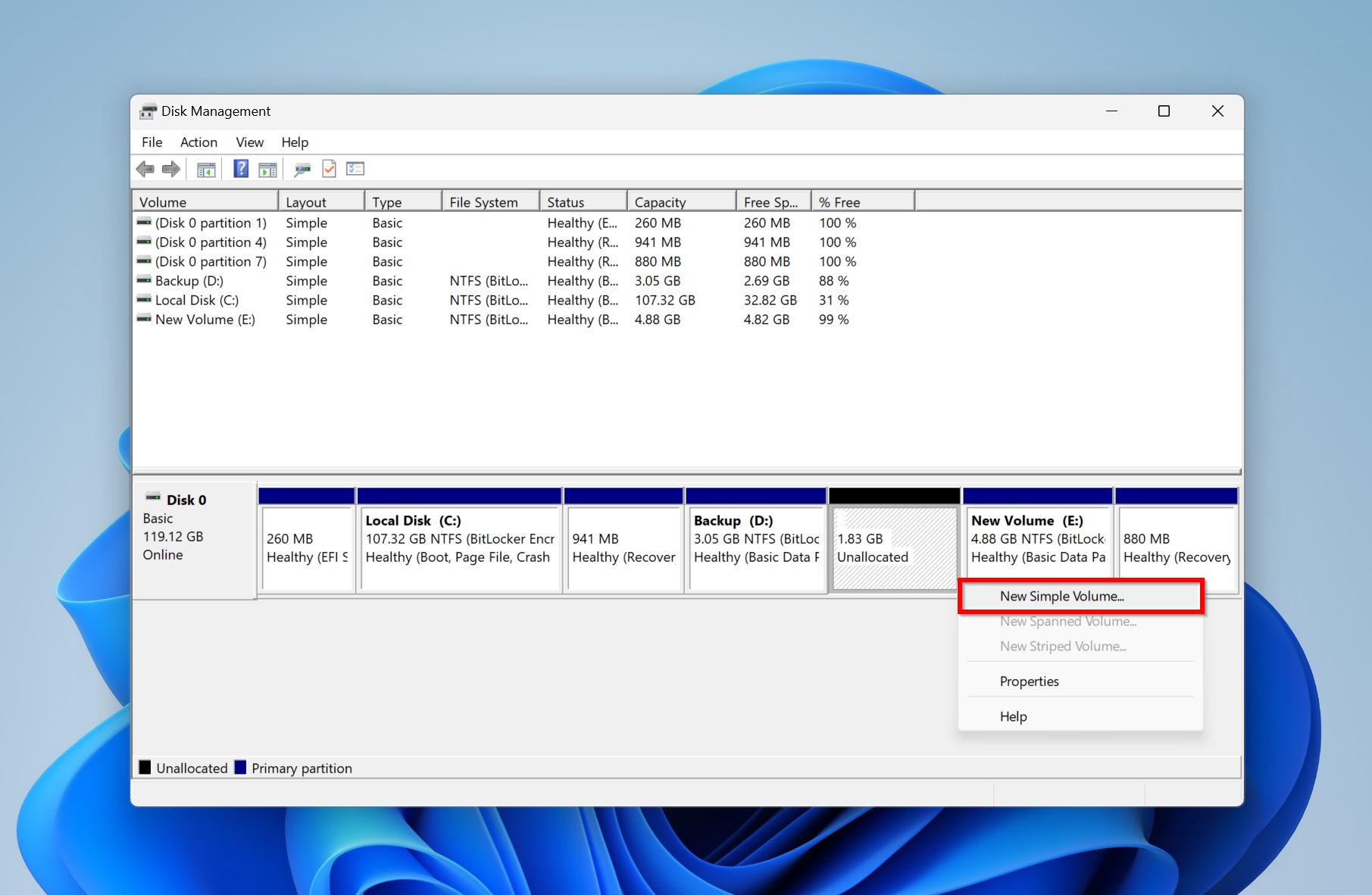 - 缩小的空间将显示为未分配在磁盘管理中。右键单击它并选择新简单卷。