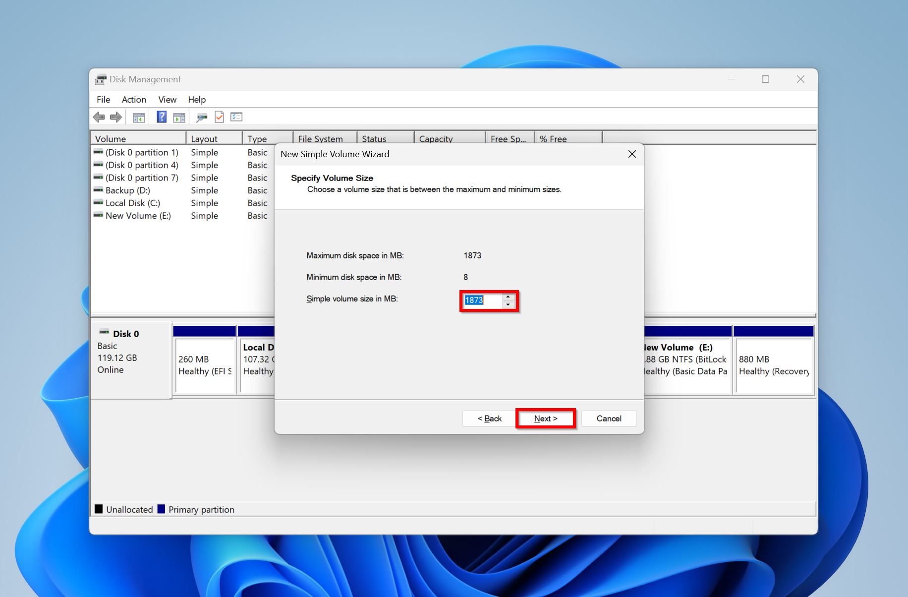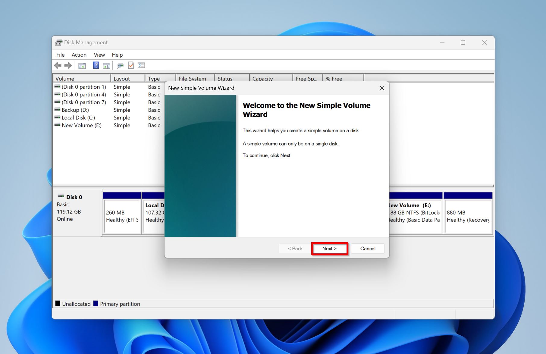 - 点击下一个在“新建简单卷向导”欢迎屏幕上。