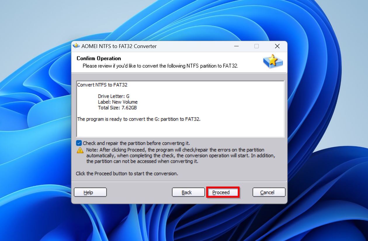 - AOMEI 分区助手会将驱动器转换为 FAT32。