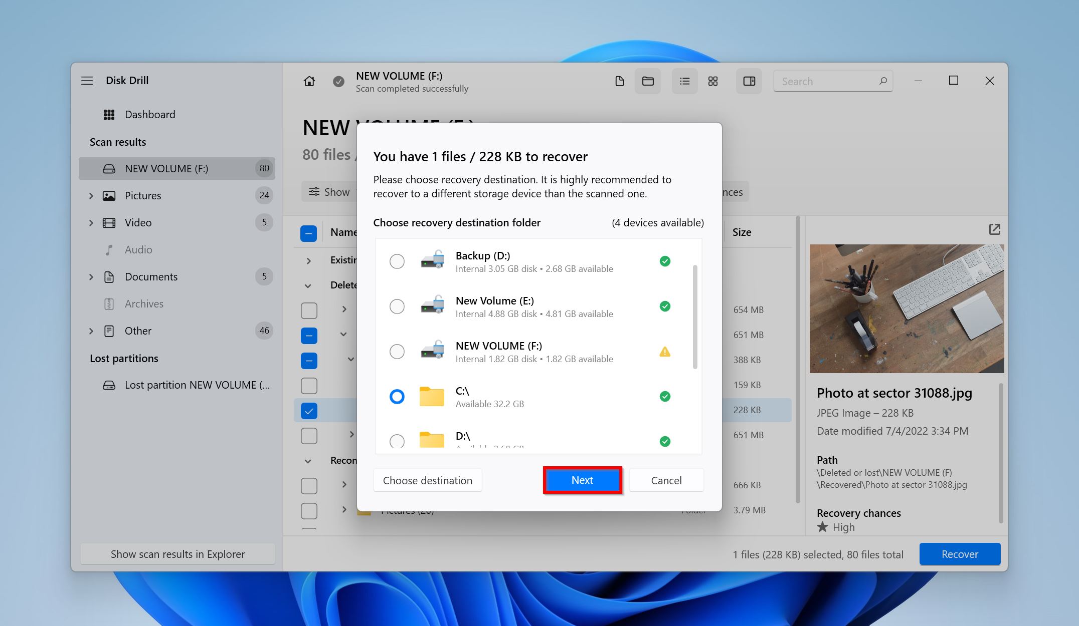 - 选择文件的恢复目标。您也可以选择最近转换的驱动器,但请记住 FAT32 不支持大于 4GB 的单个文件。点击下一个。