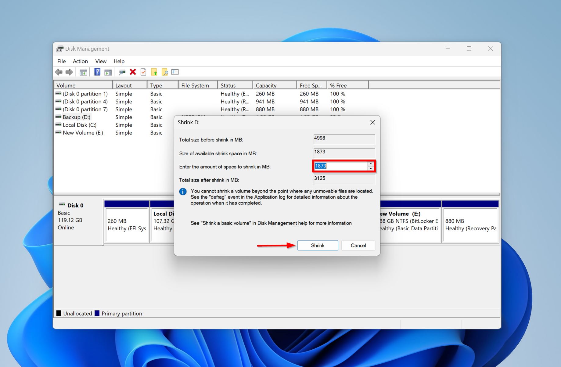 - 现在,输入您想要缩小的空间量。我们建议您在分区上保留一些可用空间,除非您确定不需要它。点击收缩。